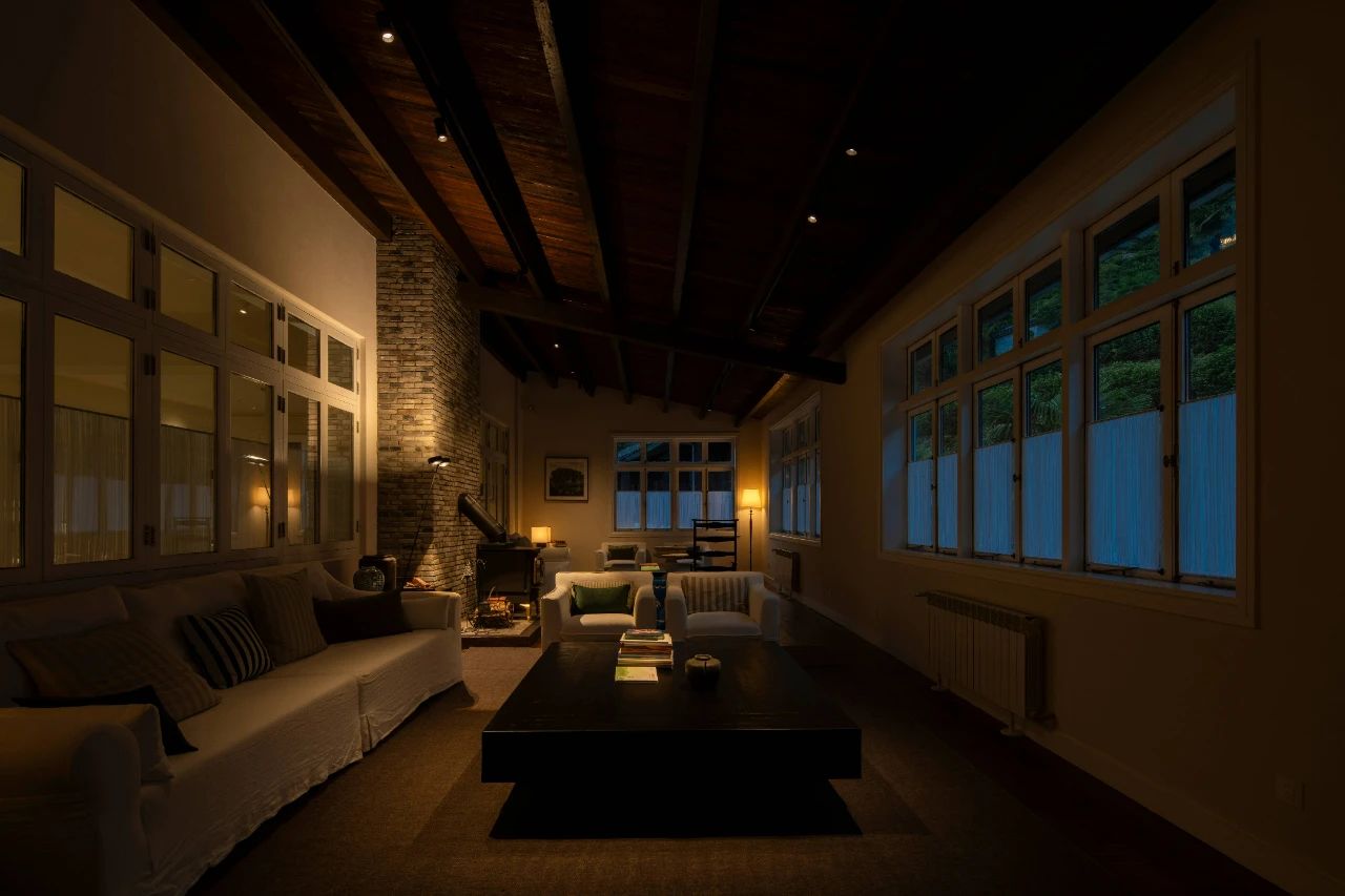 室外照明部分,通過調整景觀燈光源參數,顯著降低了鳥瞰視角下的低位眩光;同時,在門廊區域創新性運用入戶燈具,以光影層次烘托山居意境,踐行“暗天空”理念。項目通過以下設計手法實現自然與功能的平衡: