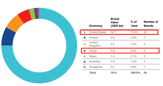 US has 32 brands on the list and China has 3 brands