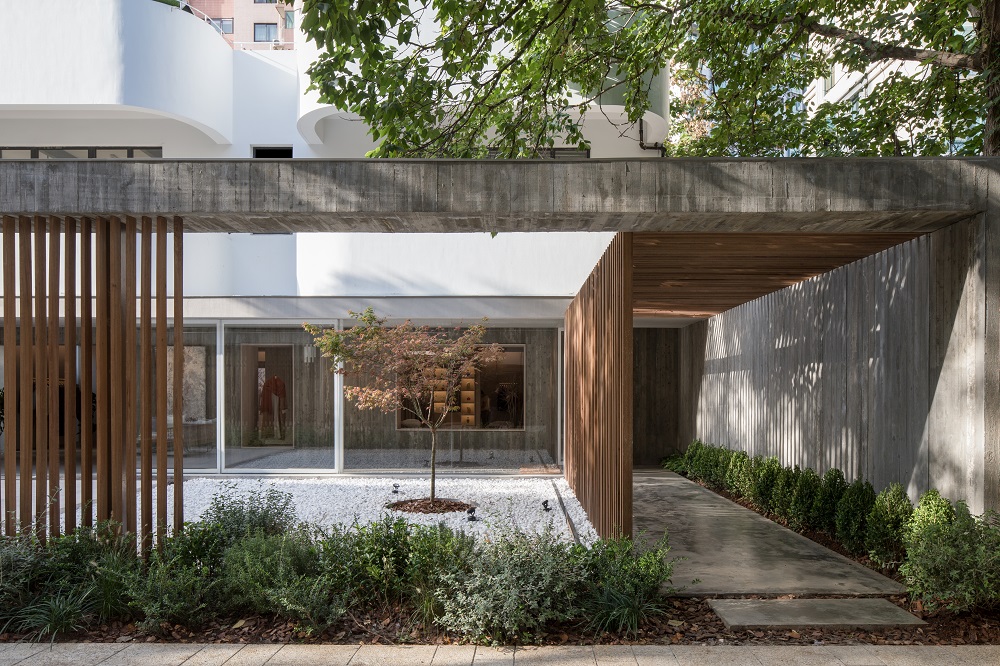 店鋪位于與主街相隔較遠的21號樓的底層,地處僻靜。芝作室將這一缺陷轉化為契機,借此打造了一個建筑游廊。涼亭式的構件被增加在極簡式庭院的外部,為店鋪賦予了寧靜低調的第一印象。這層新增的表皮由帶有木紋的混凝土預制板以及木格柵構成,伴著門前低矮的灌木叢以及院中楓樹將原有外立面掩映其中,若隱若現。每當穿行其間,視線所及之處,隨著身影移步易景,仿若一首視覺旋律。