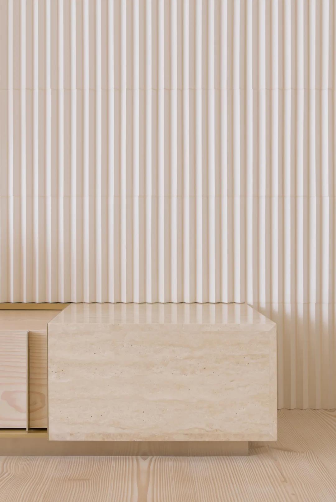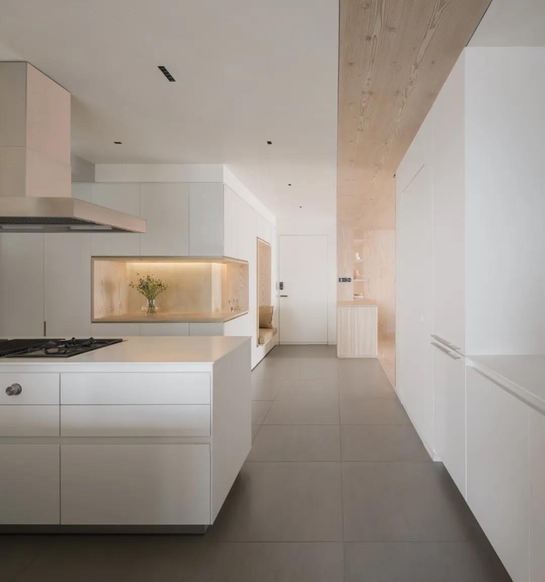 設計師還在白盒子上“掏”出三個功能各異的壁龕:臨入口處的壁龕用以坐靠換鞋,同時展現迎客示好的姿態。轉角處“缺口”用于展示藏品及增強公區的視覺聯系。狹長壁龕放置花藝作品,成為走道轉角一方可隨心更換的小景。