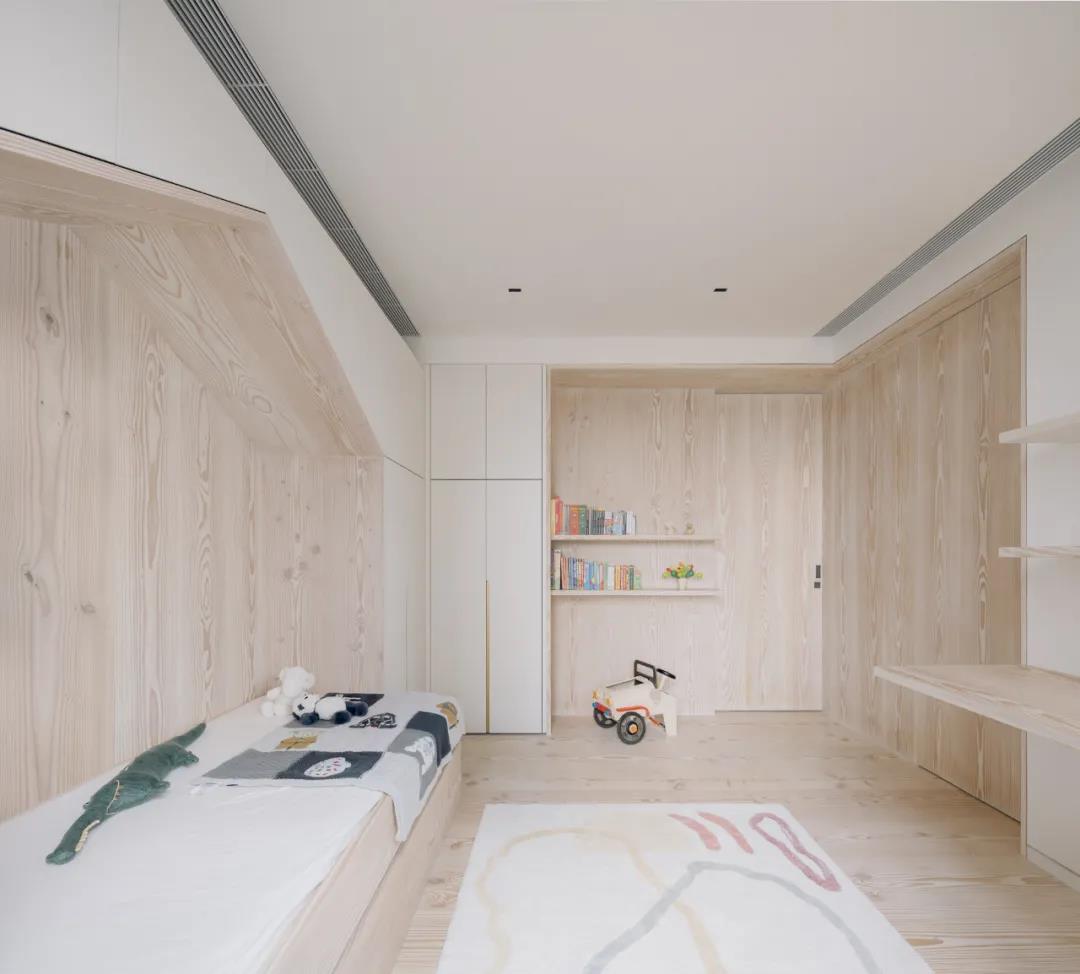 公寓西北側是兒童房,是一間由花旗松木板搭建的夢幻“小樹屋”。屋內定制有可調節高度的書桌、擱架以及大量的隱藏儲物柜,為小主人的身心成長提供安全、舒適和可持續使用的空間,培養他的動手能力和天馬行空的想象力。