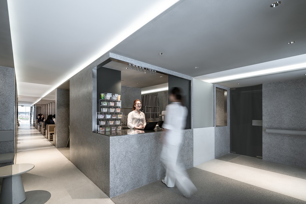 原有基地被視為一個灰色方形體塊, 與大樓的圓形標志分開; 而原有門洞被視為體塊間隙,也是光線傳入之處。空間設計運用白色材質強調光的路徑,將原本不規則的平面劃分成井然有序的區域。每一道”間隙”各承擔不同的功能:一組沿街座位,一個店鋪主入口,一個外賣站以及一個通入建筑內部的入口;而灰色體塊則承載了吧臺,等位,用餐體驗等店鋪基礎功能區。