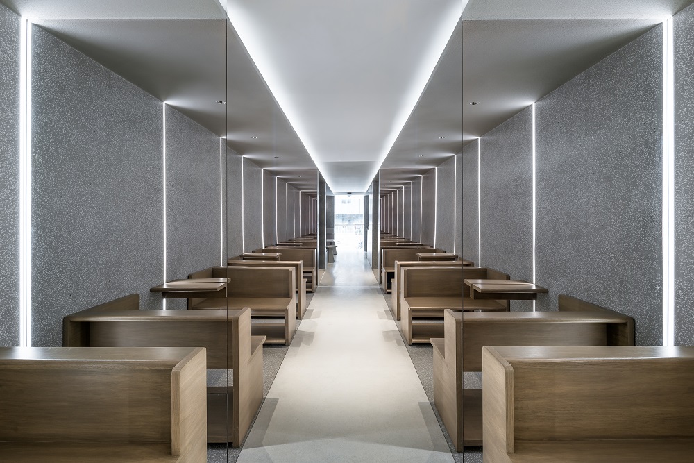 在體驗式用餐區,芝作室將鏡面材質運用在空間的前后,反射效果使白色”間隙”在空間中無限延伸。此外,前方的鏡顯玻璃后還設置了屏幕,能播放視頻或傳遞信息,使這空間得以更靈活地配合不同的活動。由于缺乏自然光照條件,芝作室在墻面 ‘引入’ 了 一系列光束,在增加照度的同時也回應了空間設計概念。定制木桌椅以朝圣空間中的家具為靈感而設計,為這小房間增添了獨有的儀式感。