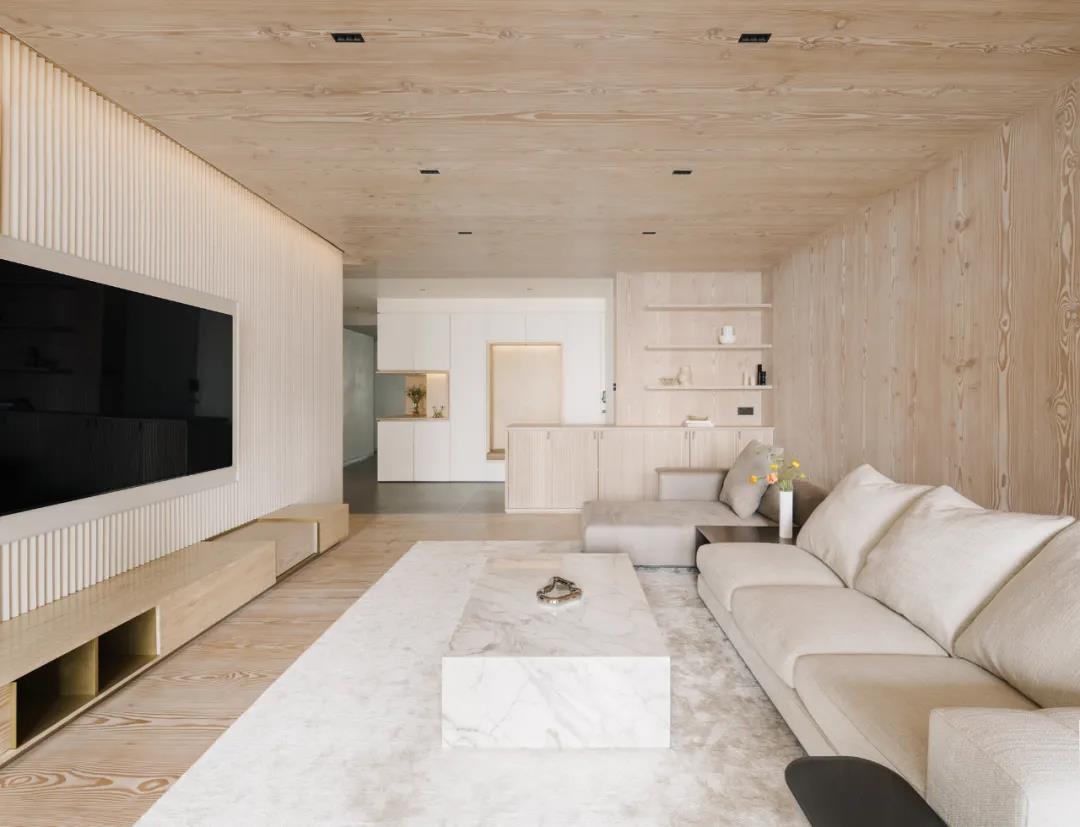 在這間公寓中,天然材料才是主角。設計師用花旗松實木板包裹公區和臥室的天地墻,制作置物架、卡座、餐桌、床架等家具,借由天然的木色、紋理與清香,讓各空間傳遞出返璞歸真的度假氣息。