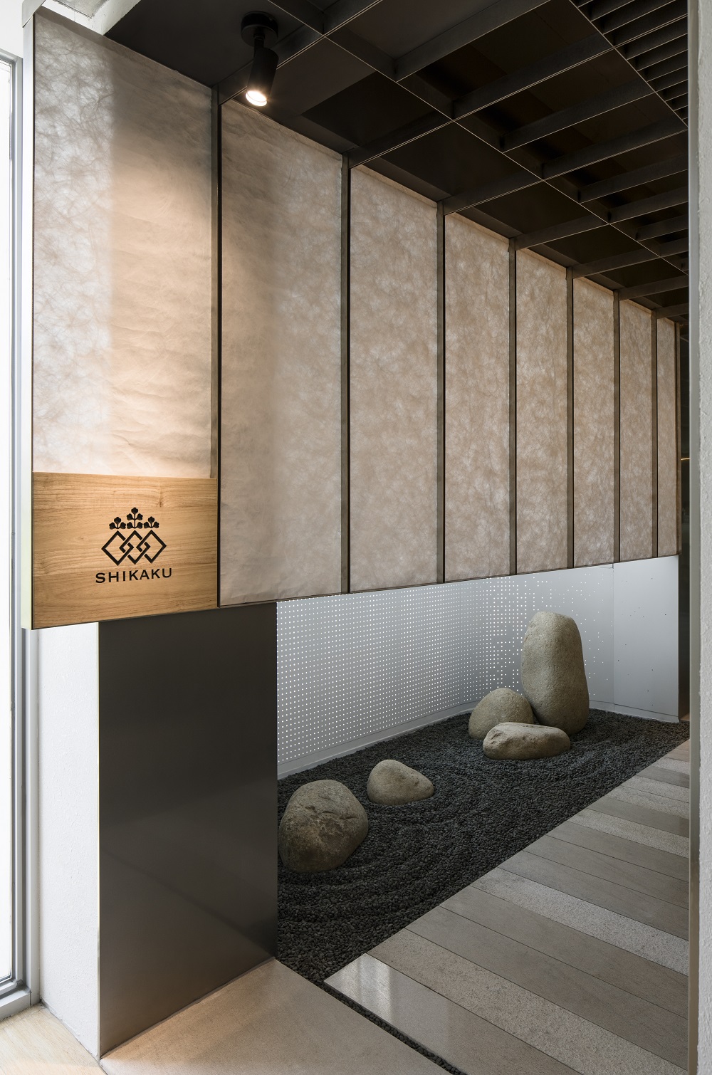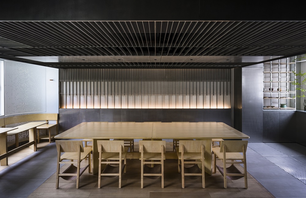 一進門,設計在此特意向含蓄的日式迎賓致敬:小巧的枯山水旁,紙障濾出柔光,與質感豐富的石板小徑共同營造一個室內的”景觀”。為了在空間里闡述中央廚房的工業基調,常見的日式木質格柵由金屬框架取代,在門口建構出豎向屏風,又在頂部水平發展,直至貫穿整個空間,為餐廳帶來一份秩序感。
