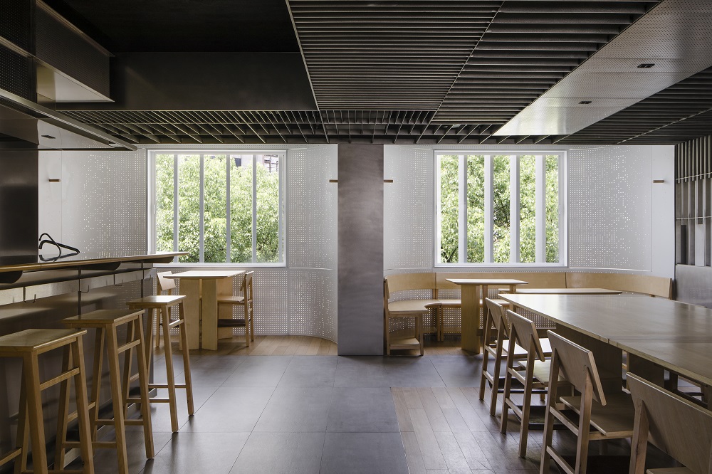 原有的一排飄窗變成三個精致的用餐壁龕,受食盒分隔不同料理的啟發,每個壁龕都設有獨特的木質家具,分別容納個人,一對或一組的食客。白色金屬曲面穿孔板遮蓋掉原有窗戶,在通風處可巧妙打開。金屬曲面只截取出窗外綠意,白色讓空間變成明亮干凈,自然光穿過窗外格柵和漸變的穿孔板隙,應著時間投射出或條狀或星星點點的斑斕光影。更多的細節藏于空間深處,頂部發展的金屬格柵在背墻演變出精巧的屏風,主餐桌上的金屬天花反射出窗外綠意,與桌面多彩食物調和照映,為空間增添瞬變景致。
