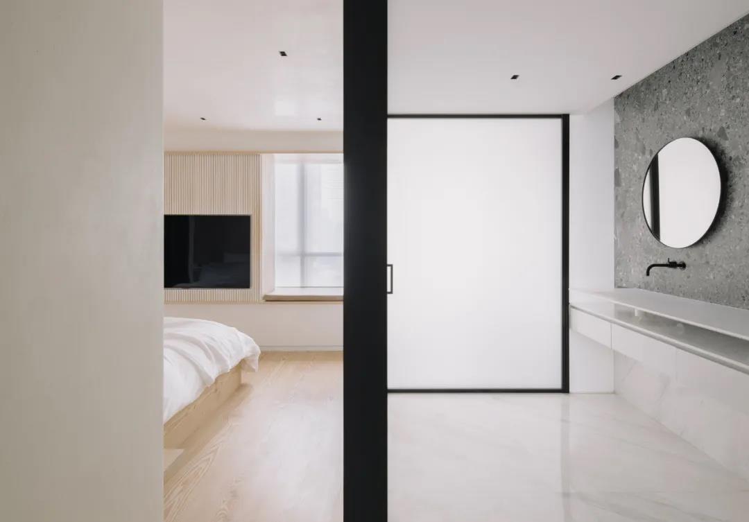 臥室區的設計根據家庭成員的喜好和需求而定,在度假主題下打造出自在的個性天地。原西南側兩間臥室被合并成一間50平方米的主臥,新增步入式衣帽間和電控玻璃圍合的浴室,電視墻左側飄窗搭配沙發變成觀景平臺,右側飄窗借由隱藏式家具構筑出女主人的梳妝空間,各區域互不干擾。